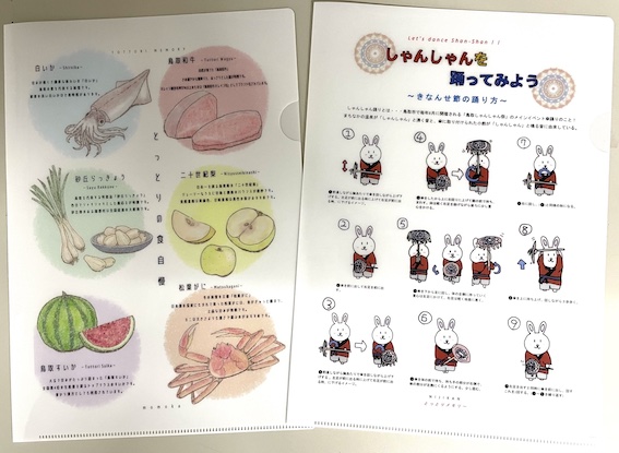クリアファイル2デザインです。ひとつは「にじかん」作「しゃんしゃんを踊ってみよう」、もうひとつは「ももか」作「とっとりの食自慢」です。なかなかかわいくていいのではないかと思います。まちなかの「鳥取市ふるさと物産館」で絶賛発売中です。ぜひ手に取ってみてください。4月末まで400円、5月から450円です。